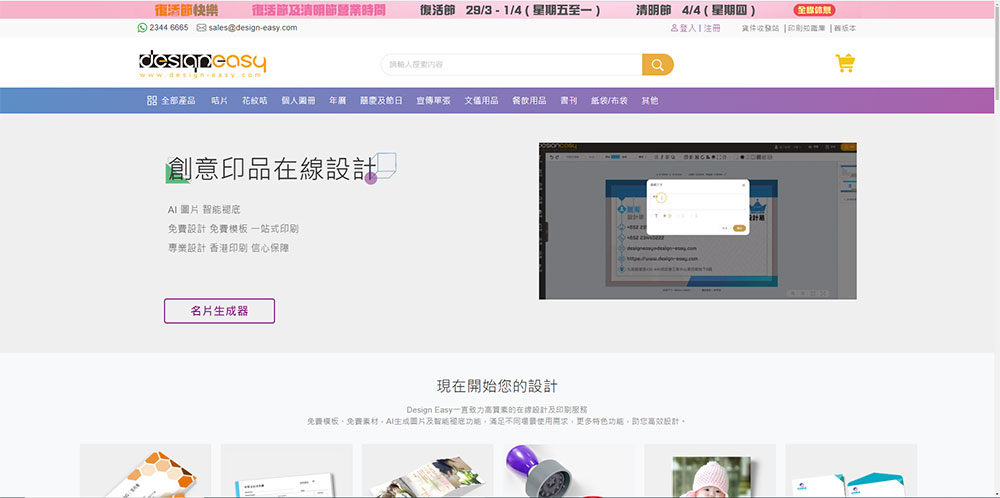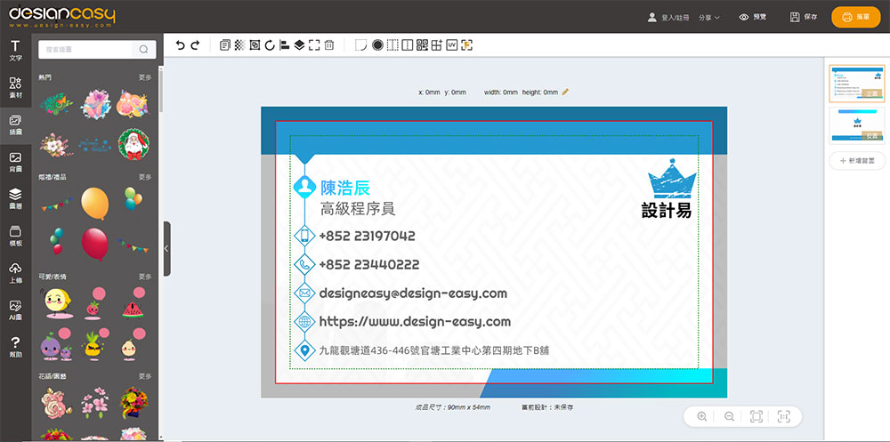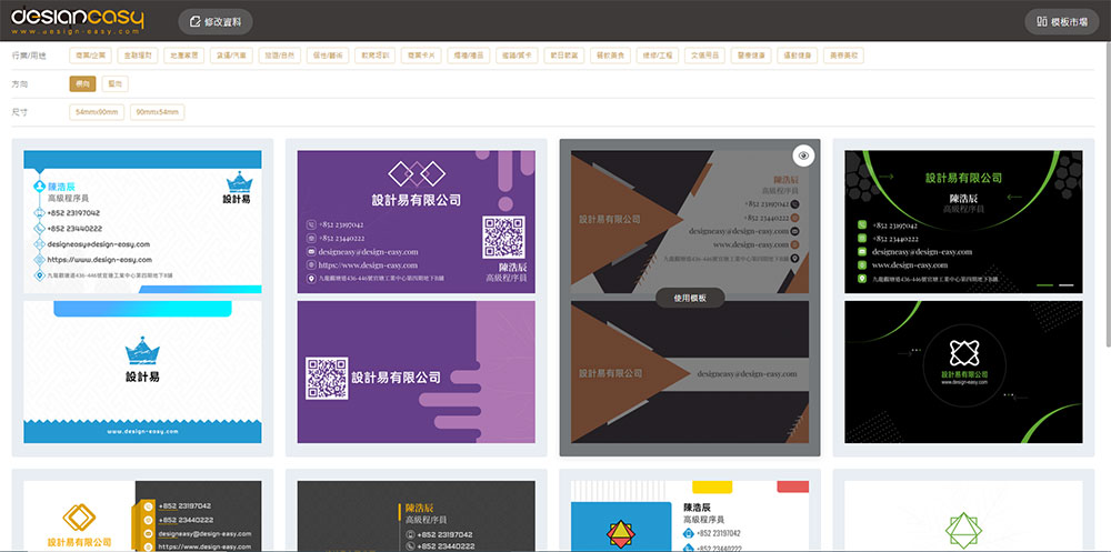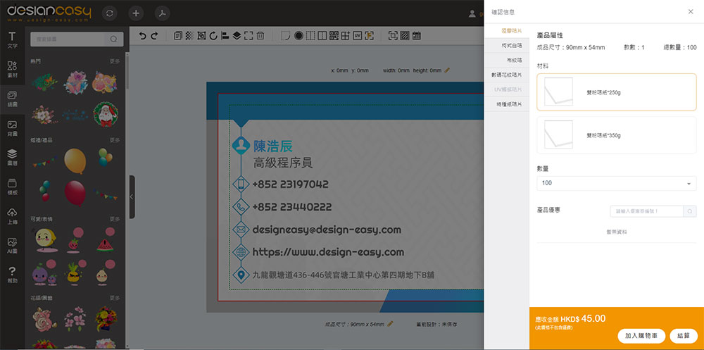 Design Easy是香港一家從互聯網上設計到實物印品一站式的名片印刷公司,名片價錢合理,提供多種取貨服務。名片用料上乘,成品品質高,還有燙金、UV、閘圓角等多種後加工選擇。Design Easy線上設計平台提供上千款免費名片範本供您選擇,操作簡單易用、設計體驗非常好,是你商務活動的最佳伴侶!下面我們將介紹如何使用Design Easy名片生成器来生成一张自己的專屬名片。