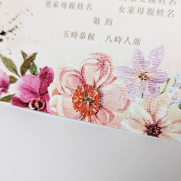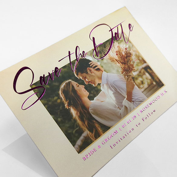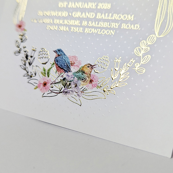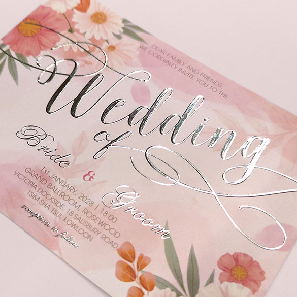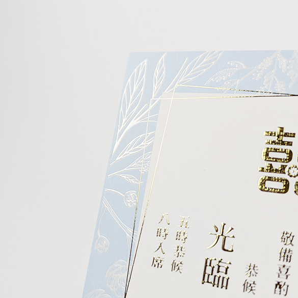 Design easy 現有後加工如立體燙工及UV等,打造專屬的囍帖/結婚卡 立體燙工 突破傳統平面燙印工藝!透過精準壓力控制與多層次版模技術,在紙材表面呈現浮雕般立體觸感,適用於品牌標誌、圖案線條的視覺強化。對比常規燙金,立體層次最高可達0.3mm,光線折射下呈現動態明暗變化,讓設計「躍然紙上」。 立體UV 採用數位定位光固化技術,在印刷品特定區域施加透明樹脂塗層,經UV燈即時固化後形成微凸透亮效果。塗層厚度可達200μm,不僅提升圖文立體度,更兼具抗刮耐磨特性,讓設計重點在光影間「跳脫紙面」。